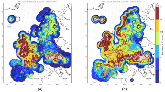 It must be noted that some unwanted side effects can be obtained when unwanted echoes, such as sea clutter, are present in a blocked area. In that case, the beam blockage correction will result in an increase of the these unwanted signals. Figure 5 shows the frequency of exceedance of the 0.1 mm/h threshold for 2012 and 2018. It allows identification of areas that are contaminated by ground echoes strong enough to be wrongly interpreted as precipitation. It is easy to identify sectors pointing towards individual radars (e.g., in southern Spain). These signals are related to transmitting devices operating at the same frequency as the radar, which clearly affect the quality of the composite [12]. The comparison of 2012 and 2018 shows a reduction of these disturbances in Eastern Europe, but an increase in other regions.