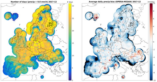 Figure 6 (left) shows the number of days in December 2017 where the precipitation intensity in any of the composites is greater than 0.0 mm/h. This data set was, subsequently, used to normalize the precipitation intensity difference (OPERA–MESAN). Figure 6 (right) shows the corresponding average daily bias for December 2017. In general, weather radars underestimated precipitation at the borders of the network due to beam overshooting. This was especially evident at Northern latitudes, but also in the South during winter. On the other hand, precipitation close to a radar is sometimes overestimated, due to remaining clutter. Interferences (e.g., Spain) and potential overcompensation effects of the central processing software (e.g., East Iceland) are clearly visible in Figure 6 (right).
