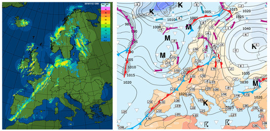 OPERA composite at 12 UTC on 12 November 2018 (left) and the corresponding weather map (right, courtesy of the Finnish Meteorological Institute).