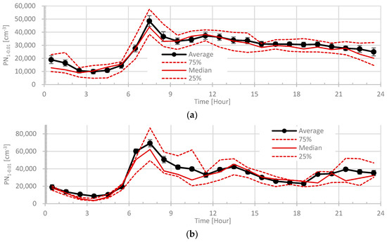 Workday diurnal patterns of submicron particle number concentrations (PN1–0.01) measured at the reference urban background sites during the pre-campaigns: (a) the campus of the University of Jordan and (b) Ma’asom in Zarqa.