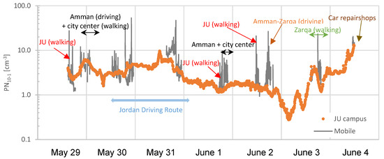 Super-micron particle number concentrations (PN10–1) measured at the reference urban background (campus of the University of Jordan) and compared to that measured with the mobile measurement campaigns.
