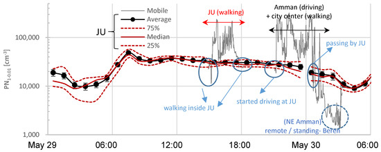 Submicron particle number concentrations (PN1–0.01) measured during mobile campaigns on May 29th and continued on May 30th. The results are plotted along with the diurnal pattern observed at the reference urban background (campus of the University of Jordan).