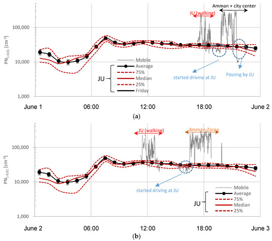 Submicron particle number concentrations (PN1–0.01) measured during mobile campaigns on (a) June 1st and (b) June 2nd. The results are plotted along with the diurnal patterns observed at the reference urban background (campus of the University of Jordan).
