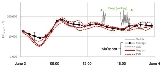 Submicron particle number concentrations (PN1–0.01) measured during walking mobile campaign in Zarqa city center on June 3rd. The results are plotted along with the diurnal pattern observed at the reference urban background (Ma’asom in Zarqa).