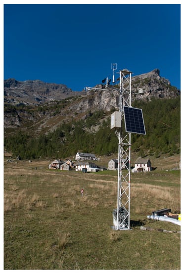 The station is located in an alluvial plain lying over a glacio-tectonic depression (Alpe Veglia plain) [18]. The installation area is surrounded by high mountain peaks, among which the highest one is Mt. Leone (3553 a.s.l.). The entrance to Alpe Veglia is a narrow 400 m deep, 250 m wide and 1 km long canyon. The considered plain is 1.6 NNW-SSE and 0.6 WSW-ENE, and its total area is approximately 0.8 . There are mixed pastures with grass and low shrubs in the Alpe Veglia and the river Cairasca flows, in the middle of the plain, towards the south–eastern border of the plain. Moreover, it is surrounded by a forest of larch trees. The plain is inhabited during the summer season, and some buildings are present grouped into four hamlets: Ciamciavero, Aione, Ponte and Cornù. The latter hamlet is where the station is located.
