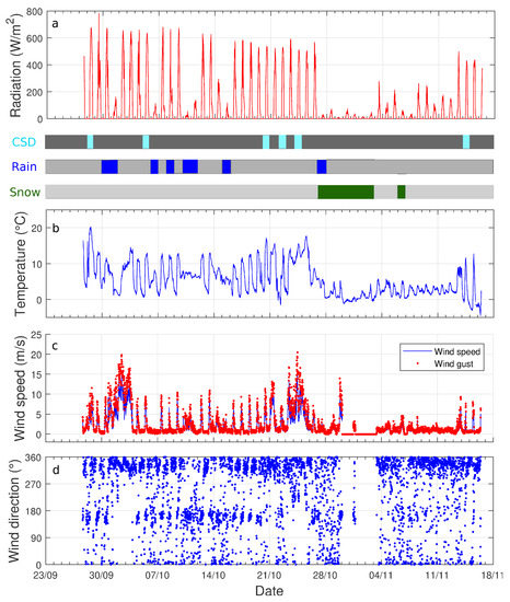 The complete analysed dataset consisted of 49 complete days. By first analysing the low frequency data, and in particular the radiometer data (Figure 4a), it emerged that only six days have a completely clear-sky (28 September; 5, 20, 22, 24 October; 14 November 2018). These days are depicted in the first timeline in Figure 4. The total precipitation for 49 days was 896 , and it was distributed over 16 days. The rainy days were: 30 September; 1, 6, 8, 10, 11, 15, 27 October (second timeline in Figure 4). It snowed between 28 October and 3 November, and the snow reached a depth of 113 . A second snowfall event affected Alpe Veglia on 6 November and the fresh snow was 10 deep (third timeline in Figure 4). The snow depth and cumulated rain from 27 September is shown in Figure 5, where the snow depth below 20 is not reliable.