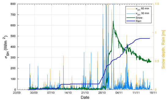 It is important to highlight that the reliability of ultrasonic anemometer measurements during rain or snow events is very low. Falling snowflakes and raindrops between the transducers in fact compromise the measurements. The weather conditions during the experiment are described briefly in Section 3.1. It is possible to see, in Figure 5, the time-series of (Equation (22)) along with the cumulated rain and the snow depth. High standard deviations were obtained during rainfall and snowfall, and this could be responsible for the poor reliability of the ultrasonic anemometer measurements during these periods. In fact, the two periods of fine and cloudy weather conditions that were identified in the temperature, short-wave incoming radiation and wind speed measurements were also captured in the SH standard deviation time series.
