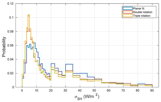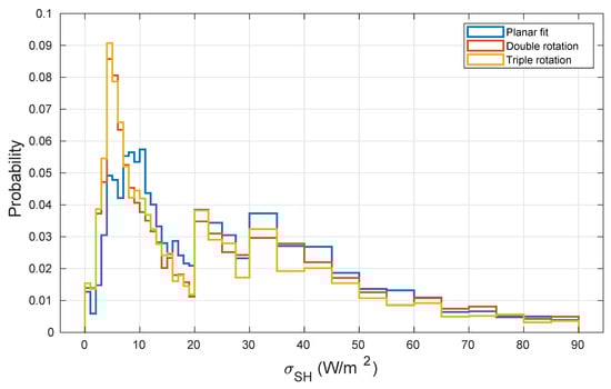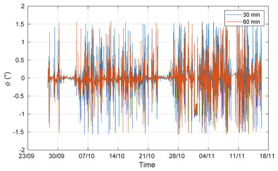 Triple rotation may be applied if, as suggested by McMillen [10], the third rotation angle is lower than 10°, otherwise, especially in low wind speed conditions, the third angle could enhance the uncertainty of turbulent quantities. The distribution of and its time evolution are depicted in Figure 8 and Figure 9; the values were always lower than ten degrees over a range of −2 to 2, and the largest variations were only found for low wind speed conditions (Figure 4c and Figure 9). As a consequence, the TR rotation produced different results from the DR rotation, albeit only under low wind conditions (notwithstanding the limit at ).