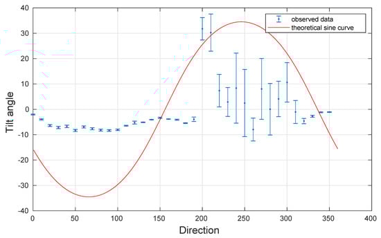 Azimuthal distribution of the tilt of the 10° wide-sector mean velocity vector above the horizontal plane. The red line was computed with planar fit coefficients and represents the ideal detected plane. The velocity vector direction (clockwise from North) indicates the direction towards which the wind blows.