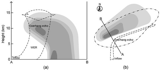 The weak echo region (WER) is a region with low radar reflectivity that is bounded on one side and above by strong echoes [10,11]. It is usually located on the low-altitude inflow side of a thunderstorm. The WER is caused by a strong updraft that carries precipitation particles to the middle levels before they grow to a radar-detectable size [12]. The strong tilted echo above WER is called overhang echo. In Figure 1, the schematic diagram of WER formation is shown. When both sides of a WER are bounded, it is a bounded weak echo region (BWER, also known as an echo-free vault). A BWER is considered to be a sign of a particularly severe thunderstorm.