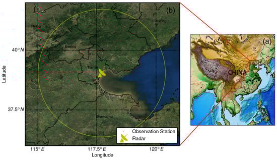 (a) General view of study area. (b) Zoomed view of the study area with the Tianjin radar and manual observation stations. The yellow circle shows the scanning range of the Tianjin radar.