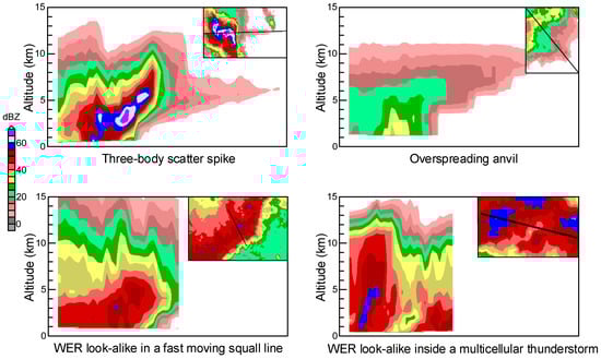 The detection algorithm presented in the previous subsection identifies WERs by their morphological definition. However, in practice, there are many WER lookalikes that are not caused by updrafts. On the one hand, signatures such as overspreading anvil and three-body scatter spike [55] are morphologically similar to WER. On the other hand, some causes such as fast-moving storms [23] and echo-connecting may make echoes look like WERs. These echoes should be filtered out as much as possible. Therefore, we designed two filters to screen candidate WER locations. Some examples of WER lookalikes are shown in Figure 6.