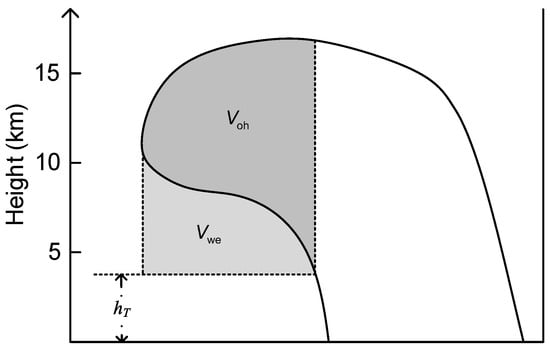 where is the horizontal grid-point set of the area where the WER is located, which is obtained by the detection algorithm, is the grid point of , and are the echo top height and echo bottom height at point , respectively, and is a user-defined height threshold, discussed later. The schematic diagram describing the two parts of volumes is shown in Figure 8.