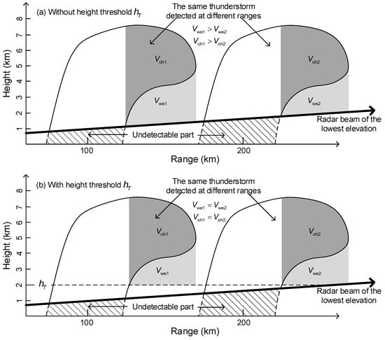 The setting of height threshold is to eliminate the influence of different minimum detectable heights on volume estimation. As shown in Figure 9a, if the same thunderstorm is detected in different radar ranges, the volumes between the undersurface of the overhang echo and the plane where the lowest radar beams are located are unequal. Therefore, we can make volumes stay constant by specifying the minimum height, as shown in Figure 9b. should be carefully selected according to radar information. When using multiple radars, thresholds should be consistent to ensure that volumes estimated by each radar are of the same standard. If radar altitudes vary, a solution is to limit the effective detection range of some radars. In this paper, , since the lowest detectable height of the far end of the radar beams is 2.077 km.