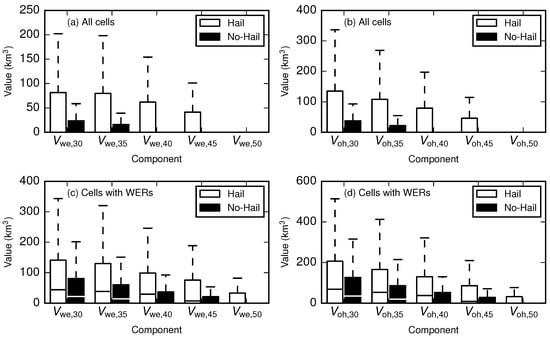 We ran the WER detection algorithm to obtain all cells with WERs and computed the values of and with reflectivity thresholds of 30, 35, 40, 45, and 50 on these cells. The values of the cells without WERs were all set to zero. Figure 10 shows the box plot of the results. From this figure, it can be seen that the median of all components was zero since most cells do not possess WERs. Except for the 50 , the distributions of and with other reflectivity thresholds were significantly different between hail and no-hail convective cells. Rare no-hail cells also have WERs with larger reflectivity than 40 . Therefore, we used and with reflectivity thresholds of 30, 35, 40, and 45 as the components of linear discriminant analysis.