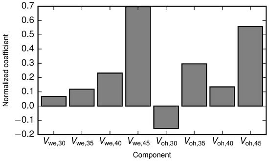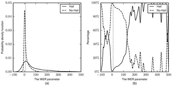 After obtaining the components, a combination method should be used to construct the quantity. Since the quantity is mainly used to distinguish hail from non-hail, a supervised dimensionality reduction method, such as linear discriminant analysis (LDA), is an ideal choice [57]. LDA is a data-driven method that finds a linear combination of features that characterizes or separates two or more classes of objects. It uses features and class labels to find a projection hyperplane that minimizes interclass variance and maximizes the distance between the projected means of the classes. Compared with unsupervised dimensionality reduction methods, such as principal component analysis, LDA can use class information to obtain a projection with more interclass discrimination. In this task, we applied linear discriminant analysis to a historical dataset that included both hail and non-hail samples and then used the obtained coefficients for a linear combination to construct the quantity (hereinafter referred to as the WER parameter). The equation for WER parameter is: