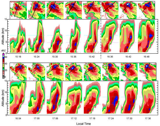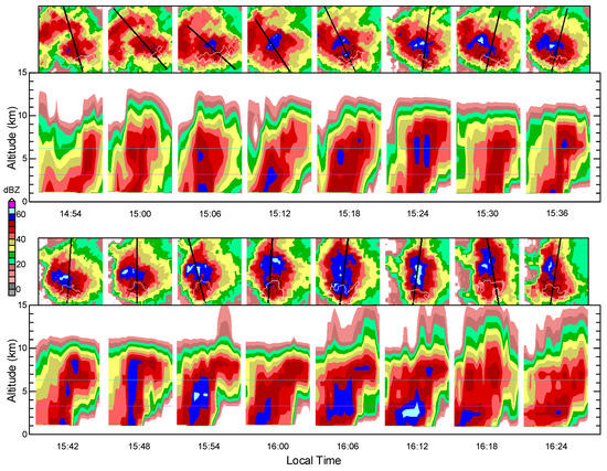 Composite reflectivity images (above) and vertical cross-section images generated automatically by the algorithm (below) of cells at each time step of Case 2 (27 July 2015). Images are superpixel-interpolated. In each composite reflectivity image, the black line is the cross-section line, and white and black contours are the locations of overhang echoes and tilted wall echoes, respectively. In each cross-section image, horizontal pink and blue lines refer to the melting layer and −20 degree layer, respectively.