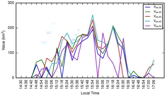 For Case 1, the thunderstorm initiated in the south of Beijing and moved toward the south after 14:24 local time (LT = UTC + 8), 10 June 2014. Observation stations on the moving path started to report hail from 15:42 LT. At 14:54 LT, the algorithm started to detect WERs in the south of the cell. As convective cells evolved, WERs became larger. From Figure 15, it can be seen that the WER became largest at 07:54 LT and then began to decay. The cross-section images from 14:54–16:12 LT in Figure 14 show that WERs were bounded on both sides (BWERs).