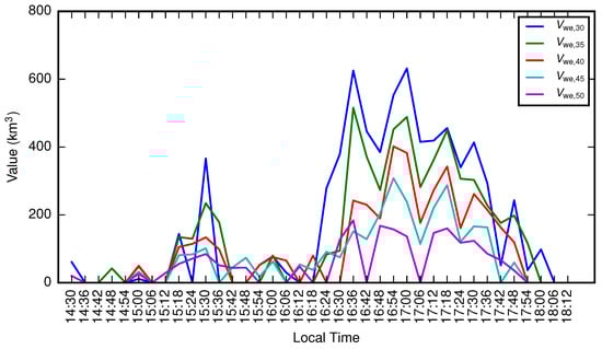 Considering the diversity and complexity of a WER structure, it is difficult to measure directly and represent it with one quantity. An alternative solution is to construct a quantity that is a combination of multiple components. Each component is a simple measurable value of one part of the WER. Several points were considered while selecting the components. First, previous studies found that broader updrafts are favored for enhanced hail growth [17,19,20]. The volume of the WER could reflect updraft width. Second, the echo overhanging the WER contains supercooled liquid water on which hail growth is dependent [26]. Thus, the intensity and volume of overhang echo may be relevant. Third, multiple reflectivity thresholds can be used to adapt to different thunderstorm events. Therefore, the following two kinds of volumes with different reflectivity thresholds were used as the components: