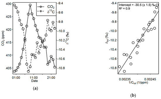 - Pataki, D.E.; Ehleringer, J.R.; Flanagan, L.B.; Yakir, D.; Bowling, D.R.; Still, C.J.; Buchmann, N.; Kaplan, J.O.; Berry, J.A. The application and interpretation of Keeling plots in terrestrial carbon cycle research. Global Biogeochem. Cycles 2003, 17. [Google Scholar] [CrossRef]