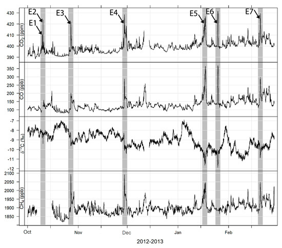 - Tuzson, B.; Henne, S.; Brunner, D.; Steinbacher, M.; Mohn, J.; Buchmann, B.; Emmenegger, L. Continuous isotopic composition measurements of tropospheric CO2 at Jungfraujoch (3580 m a.s.l.), Switzerland: Real-time observation of regional pollution events. Atmos. Chem. Phys. 2011, 11, 1685–1696. [Google Scholar] [CrossRef]