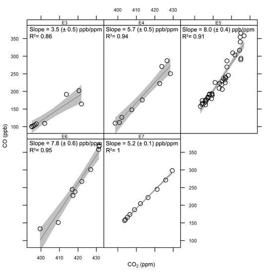 - Ammoura, L.; Xueref-Remy, I.; Gros, V.; Baudic, A.; Bonsang, B.; Petit, J.-E.; Perrussel, O.; Bonnaire, N.; Sciare, J.; Chevallier, F. Atmospheric measurements of ratios between CO2 and co-emitted species from traffic: A tunnel study in the Paris megacity. Atmos. Chem. Phys. 2014, 14, 12871–12882. [Google Scholar] [CrossRef]