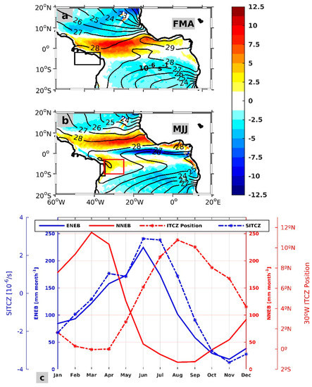 The precipitation regime over Northeast Brazil (NEB) is known to be related to climatic variability in the tropical Atlantic [1,2,3,4,5,6,7,8,9,10,11,12]. The peak seasonal rainfall in Northern NEB (see black box in Figure 1a) is concomitant with the southernmost position of the intertropical convergence zone (ITCZ), which remains near the equator during February-March-April (FMA) (Figure 1a,c). The year-to-year variability of the seasonal rainfall in Northern NEB is affected by the inter-hemispheric mode of sea surface temperature (SST) in the tropical Atlantic, which is associated with the anomalous latitudinal displacement of the ITCZ [5,7,8,13] between February and May.
