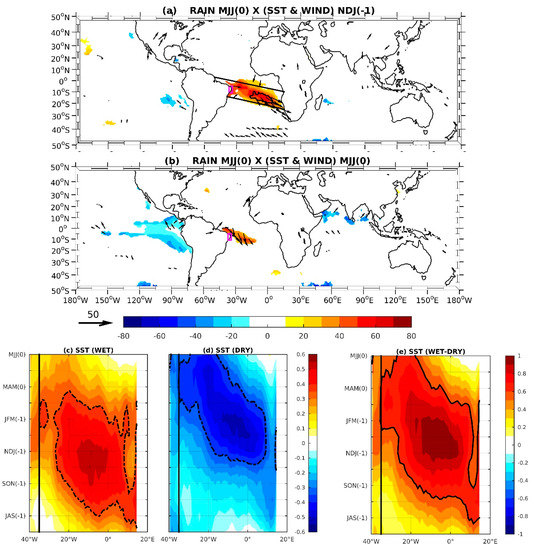 The significant positive relationship between the tropical South Atlantic SSTA and the MJJ Eastern NEB rainfall moves westward from NDJ and concentrates only near the NEB coast just before or during the rainy season (Figure 2b). This observation is consistent with results in [38]. The westward displacement of the SSTA relationship is confirmed in Figure 2c,d, in which we show the longitude-time diagram of the WET and DRY composites of standardized SSTA along the diagonal band indicated in Figure 2a. However, the largest values of the positive and negative SSTA linked to WET and DRY events, respectively, in Eastern NEB are not symmetric during the westward propagation. The high positive SSTA linked to WET events in Eastern NEB start early in the eastern portion of the basin and reach the western portion earlier than the strong negative anomalies. The vertical black lines at 35° W in Figure 2c–e represent the eastern limit of the Eastern NEB. This result is mainly due to the seasonality of the amplitude of variability of the positive and negative SSTA used for the composites. Indeed, the difference between the standard deviations of the positive and negative SSTA presents high positive values from November to March and negative values from April to August in the southeastern tropical Atlantic (not shown). This means that from November to March, positive SSTA in the tropical South Atlantic exhibit higher interannual variability than negative SSTA for the study period. Contrarily, negative SSTA present higher variability than positive SSTA from April to August. Figure 2e shows the longitude-time diagrams of the differences between composites (WET–DRY) of standardized SST anomalies, corresponding to rainfall events in Eastern NEB. The difference between composites of SSTA is positive during a long period of the year (Figure 2e). As noted previously, a positive SST signal propagates westward from the African coast to the western part of the basin. The positive values of the WET–DRY difference start in the eastern part of the basin during the boreal fall of the year preceding the Eastern NEB rainfall events; they reach the western part at the beginning of the next year and then remain there until MJJ(0). The strongest values for the differences between SSTA composites are centered near 10° W in DJF(0).