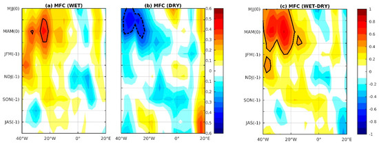 To illustrate how the variability of the surface oceanic–atmospheric conditions in the tropical South Atlantic can be linked to the rainfall in Eastern NEB, we perform a longitude–time diagram of the MFC anomalies (Figure 3). Positive anomalies of MFC are observed near the coast for the composite of WET years from MAM to MJJ (Figure 3a). For the composite of the DRY years, large negative anomalies of the MFC are marked from MAM to MJJ, with the highest values observed in MJJ (Figure 3b). The amplitude of the negative MFC anomalies is stronger than that of the positive MFC anomalies near the Eastern NEB coast during the period corresponding to the peak of the rainy season. This suggests that the deficit of the MJJ Eastern NEB rainfall is highly associated with negative MFC anomalies over the oceanic region near the coast. The large negative MFC anomalies observed near the NEB coast in MJJ during the DRY years are certainly linked to the negative SSTA, which are high during the peak of the rainy season (Figure 2c). In the same way, the relatively weak positive MFC anomalies noted near the NEB coast in MJJ during the WET years are linked to weak positive SSTA observed during MJJ. The difference between the WET and DRY composites of anomalies of MFC is positive and high from MAM to MJJ in the western part of the tropical South Atlantic (Figure 3c).
