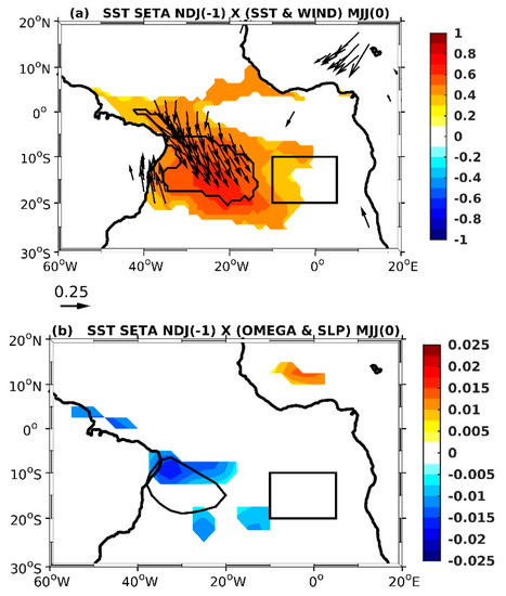 To understand how the dynamic link between the SSTA in the SETA and subsequent rainfall events in Eastern NEB develop, we first analyzed the distribution of the lagged linear regression (°C/°C) of the SSTA in SETA during NDJ(−1), with the gridded SST and surface wind anomalies in MJJ(0) during 1960–2015 (Figure 4a). This analysis highlights the link between the SSTA in SETA in NDJ(−1) and the gridded SST and surface wind anomalies over the entire tropical Atlantic basin in MJJ(0). It appears that this positive relationship passes through the oceanic portion near the eastern coast of Brazil, i.e., in the southwestern Atlantic warm pool [34,54,55], where the SITCZ signal is large (see Figure 1b). This observation supports the idea that a portion of the NDJ SSTA in SETA is transported westward to the coast of NEB. The interannual variability of the SITCZ should, then, be related to the westward propagating SSTA from the eastern part of the tropical South Atlantic. The NDJ SETA SSTA is also associated with an anomalous cyclonic surface atmospheric circulation (i.e., a convergence of surface winds) near the coast in MJJ. When located in the western part of the basin, the positive SSTA are also associated with anomalously low surface pressure and an upward vertical velocity at 500 hPa (Figure 4b).