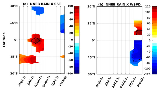 During the Northern NEB rainy season, i.e., FMA(0), the positive relationship in the tropical South Atlantic is moved to the center of the basin immediately south of the equator, and the inter-hemispheric mode is established with a large negative relationship in the tropical North Atlantic in FMA(0) (Figure 5b). This SST meridional mode in FMA is associated with a strong meridional gradient of surface wind, namely, the northeasterly (northwesterly) signal in the northern (southern) hemisphere. The negative coefficient of the SSTA and the associated anomalous southeasterly surface wind are also increased in the equatorial Pacific during Northern NEB’s rainy season. We also note a weak negative relationship for SSTA, which is associated with an abnormal westward surface wind in the equatorial Pacific during this season. Therefore, the well-known influence of the negative/positive phase of the tropical Atlantic inter-hemispheric mode and/or the La Niña/El Niño in the equatorial Pacific on the positive/negative anomalies of Northern NEB rainfall [5,7,8,10,12,13] is clearly visible, with the strongest signal occurring during the first months of the year (Figure 5b). Furthermore, a negative signal is also observed with the SSTA in the Indian Ocean.