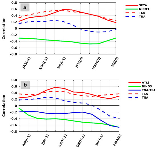 Seasonal evolution of the lagged linear correlation coefficient between (a) MJJ rainfall anomalies in Eastern NEB and the SETA (red line), the NINO3 (green line), the tropical South Atlantic (TSA, 20° S–0°; 40° W–15° E, red dashed line), and the tropical North Atlantic (TNA, 0°–20° N; 60°–15° W, blue dashed line) SSTA for the period 1980–2015, (b) FMA rainfall anomalies in Northern NEB and the ATL3 (red line), the NINO3 (green line), the Atlantic dipole (blue line; tropical North Atlantic—tropical South Atlantic (TNA-TSA)), the TSA (red dashed line), and the TNA (blue dashed line) SSTA for the period 1980–2015. Correlations higher than ± 0.32 are significant at a 95% confidence level, according to the t-test, for (a,b).