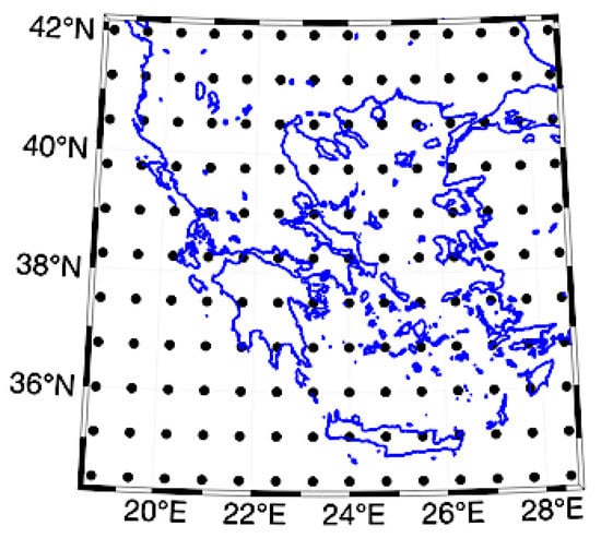 The daily temperature time series in this study were extracted from the ERA-Interim reanalysis dataset of the European Centre for Medium-Range Weather Forecasts (ECMWF). It should be noted that the mean daily 2 m temperature data values were calculated as the mean value of the four available synoptic hours per day (00, 06, 12, and 18 UTC). The covered area is 34.50° N–42.00° N and 18.75° E–28.50° E using a 0.75° × 0.75° grid, and the relevant points are illustrated in Figure 1. Therefore, 154 (11 × 14) grid points were used, that cover uniformly the Greek area for a 35-year period (January 1979 to December 2014). The 2 m temperature values of the ERA-Interim dataset were estimated using not only surface temperature observations but also other data sources, mainly satellite observations. From the assimilation of the observations, ERA Interim produces four analyses per day at 00, 06, 12, and 18 UTC. Therefore, there are four temperature values per day and per grid point and, in this study, each daily temperature value is the average of these four values for each grid point. Moreover, each temperature value encompasses observations before and after the specified observation time, i.e., for the production of the 00 UTC analysis, observations taken between 15 UTC on the previous day and 03 UTC on the present day were used and, similarly, observations taken between 03 and 15 UTC were used for the analysis of 12 UTC. The use of temperature data from reanalysis datasets has additional advantages related to data completeness and the quality control of the time series. A complete description of the ECMWF ERA-Interim dataset can be found in [] and [].