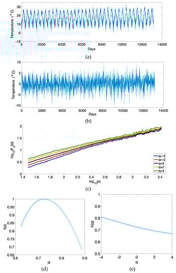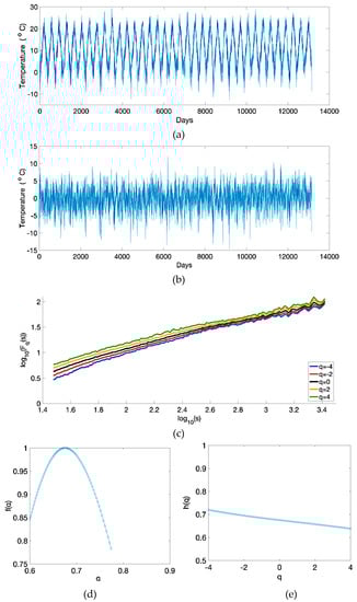It should be noted that Fq(s) is plotted for s ranging from 101.5 to 103.5 in days. In all cases, the form of Fq(s) plots is almost linear, and, for different q values, their distance is decreased when s increases. This is attributed to the fact that, for small segments (small s values), local periods with small fluctuations (negative q) are easier to distinguish from periods with large fluctuations (positive q). On the contrary, large segments include periods of both small and large fluctuations and therefore the differences in magnitude are cancelled []. This results in the behavior of Fq(s) for large segments being similar to monofractal time series (i.e., the Fq(s) for monofractal time series is independent of q and in that case the Fq(s) lines coincide). The multifractal character of the temperature time series is exhibited from the fact that the Hurst exponent is dependent on q (Figure 2d) and from the upside-down parabola form of the multifractal spectrum (Figure 2e). In more detail, in all cases h(q) > 0.5, and consequently the temperature time series are long-range positively correlated and therefore it is highly likely that an increase/decrease in temperature values will be followed by another increase/decrease.