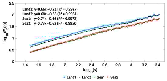 Log-log plots of F2(s) for two grid points located over land (Land1: 39.75° N, 21.75° E, Land2: 37.50° N, 22.50°E) and for two points located over sea (Sea1: 35.25° N, 27.75° E, Sea2: 36.75° N, 21.00° E) along with the linear fit equations and the corresponding coefficient of determination R2 values.