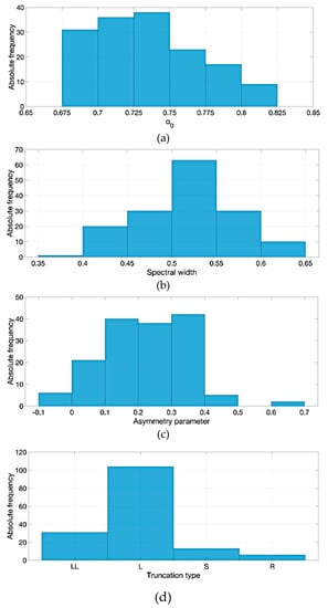 Regarding the asymmetry parameter and truncation type spatial distributions, the reanalysis data findings are in accordance with the observational records results (positive values dominate in the experimental domain). The close relationship between the asymmetry parameter and truncation type, though it is not straightforward, is verified by Table 2. In general, left-truncated spectra are related to higher asymmetry parameter values than right-truncated spectra. In the latter case, the values of the asymmetry parameter are negative.