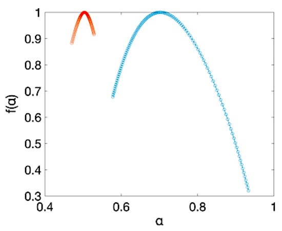 The quantity α is called singularity strength (or the Hölder exponent) and f(α) expresses the dimension of the subset of the time series that is characterized by α. The plot of α versus f(α) is called a singularity spectrum (or multifractal spectrum). The value of α where f(α) takes its maximum value is when df(α)/dα = 0, satisfied when q = 0. From (4), it is found that f(α)max = 1. This value of α corresponds to the most dominant scaling behavior [] and it is the dominant Hurst exponent. Hereafter, this quantity will be denoted by αo. Another important feature of the spectrum is its width (αmax–αmin), where αmax and αmin are the maximum and the minimum values of α for which f(α) = 0, which is a multifractality measure. A spectrum with a broad width has a strong multifractality (i.e., it has a ‘fine’ structure). If the width decreases, then the multifractality becomes weaker and the time series tends to be a monofractal one. The spectrum width of a pure monofractal time series is equal to zero. More details about the multifractal spectrum can be found in []. As recommended by Shimizu el al. [], a measure of the width of the multifractal spectrum can be obtained by fitting a second-order equation to the curve of the spectrum around αo, according to: