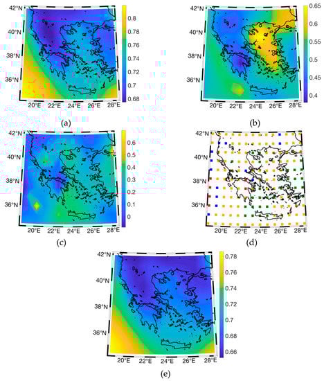 The spatial distribution of the asymmetry parameter (Figure 7c) exhibits lower values over a part of continental Greece. This could be attributed to the fact that local weather parameters have a ‘noisy’ contribution to the multifractal spectrum, where the existence of low fractal exponents cancels out the right skewness caused by high fractal exponents. Additionally, the asymmetry parameter has, in general, higher values over the Aegean Sea than over other marine areas. This could be explained partially by the persistence of the Etesian winds [] during summer, which affects accordingly the temperature field over the Aegean Sea. A similar situation is observed at the spatial distribution of truncation type (Figure 7d), where areas with lower values of asymmetry parameters appear to have a symmetrical or right-truncated spectrum.