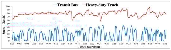 The oxides of nitrogen (NOx) emitted from heavy-duty diesel engines are considered to be important sources of atmospheric pollution []. A urea-selective catalytic reduction (SCR) system is used to reduce the NOx emissions from heavy-duty diesel engines [] by injecting urea at a sufficiently high exhaust temperature (generally at 200 °C) []. At present, the urea injection strategy of the SCR system for heavy-duty diesel vehicles (HDDVs) is designed based on the European transient cycle (ETC) and the European steady-state cycle (ESC). However, for different source types of vehicles equipped with the same engine and SCR system, the operating modes could be significantly different [,,,]. As shown in Figure 1 (the data is the field operational data of Beijing heavy-duty buses and heavy-duty trucks collected in 2018 using GPS), urban transit buses frequently operate at a lower speed range than heavy-duty trucks, while heavy-duty trucks run fairly smoothly at a high-speed range.