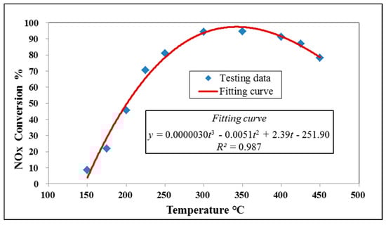 Nitrogen oxides (NOx) conversion rate of a heavy-duty truck at different temperatures. (NH3/NOx = 1, Space velocity = 20,000 h−1) [].