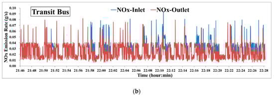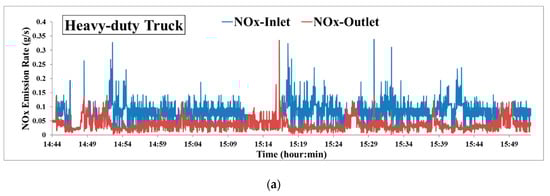 The NOx emission rates from different source types of heavy-duty diesel vehicles (HDDVs) at the inlet and outlet of the selective catalytic reduction (SCR) system. (a) NOx emission rates of a heavy-duty diesel truck (HDDT) at the inlet and outlet in the SCR system. (b) NOx emission rates of a transit bus at the inlet and outlet in the SCR system. []