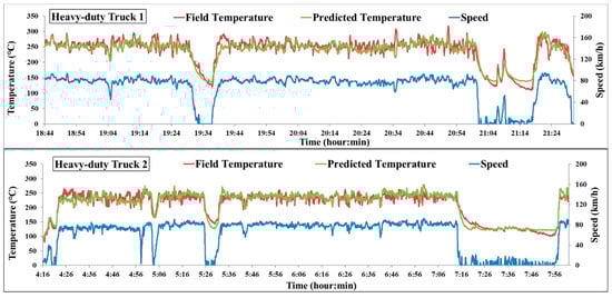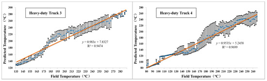Two heavy-duty trucks that were excluded in the parameter calibration were selected for the validation. The 17,765 records were selected from the first vehicle, and the second-by-second data from 17:57 to 20:52 was selected from another vehicle. Based on the correlation analysis, the predicted temperature linearly correlated with the field temperature, and the goodness of fit (R2) was 0.95 and 0.97, as shown in Figure 5. The average absolute error percentage was 5.3%. It was shown that the proposed temperature model was reasonable and reliable, and was capable of representing the real-world situation.