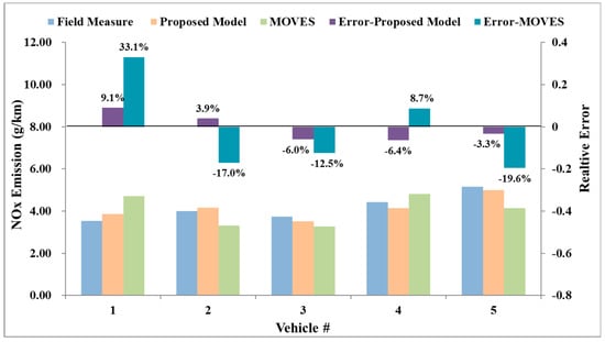 The proposed method resulted in a better performance than the MOVES method. Relative errors related to NOx emissions using the proposed method for each vehicle were reduced by 24.0%, 13.1%, 6.5%, 2.3% and 16.2%, as shown in Figure 6. The proposed method can substantially improve the accuracy of emission estimates for transit buses because the method is based on the temperature in calculating conversion rates to determine the NOx emissions. In this model, PEMS instrument (Maha PEMS) was used to collect NOx emissions from vehicles not equipped with SCR systems as NOx concentrations at the inlet of the SCR system, and an emission rate database at different VSP bins was established. The NOx emissions at the outlet of the SCR system were calculated in conjunction with the field operating data of the vehicles and the established temperature model. Therefore, the NOx emissions were calculated accurately according to the temperature model by acquiring the second-by-second speed data of a certain vehicle. However, the traditional model directly obtained the NOx emissions at the exhaust pipe outlet of vehicles equipped with SCR systems using PEMS instruments and established a database of emission rates under different VSP bins. Then, the NOx emissions of other vehicles were directly calculated based on the second-by-second speed data, regardless of the effect of temperature on emissions. Significant differences of operating conditions between the predicted vehicle and the test vehicle were observed, which resulted in the temperature variation corresponding to the same VSP. This lead to the difference in NOx emission rates and total emissions. Therefore, the traditional model leads to an inaccurate evaluation of NOx emissions from the HDDVs equipped with the SCR system.