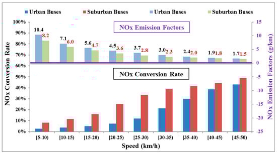 - The NOx emissions and urea injection from vehicles equipped with the SCR system show a significant variation in difference, even in the same operating modes. In this case, for transit buses, the average EFs of urban buses are higher than the EFs of suburban buses at the same speed interval. For HDDTs, the average EFs of the restricted access are higher than the unrestricted access at the low-speed interval, which are the opposite at the high-speed interval. The average conversion rate of HDDTs is 39.2% higher than transit buses.