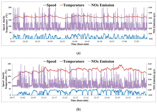 Comparison of speed, temperature, NOx conversion rate and NOx emissions of HDDTs in different operating modes. (a) Operating in restricted access; (b) Operating in unrestricted access.