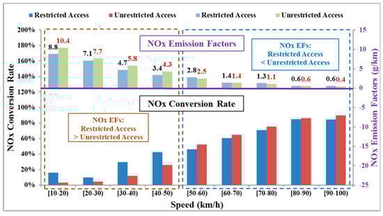 In order to analyze the NOx emission characteristics of HDDTs under different operating modes, four HDDTs operating in restricted access and others operating in unrestricted access were analyzed. The total emissions of each trajectory were grouped into speed intervals with an interval of 10 km/h, as shown in Figure 9. At the low-speed interval, the difference of average conversion rate of NOx was 13.1% under different operating modes. The average EFs of HDDTs operating in restricted access were higher than the EFs of HDDTs operating in unrestricted access. At the high-speed interval, the difference of average conversion rate of NOx was 4.2%. Then, the average EFs of HDDTs operating in restricted access were lower than the EFs of HDDTs operating in unrestricted access. In order to explain the differences, trajectories of HDDTs were studied, which are shown in Figure 10. In the low-speed interval (0–50 km/h), the acceleration and deceleration of the HDDTs operating in unrestricted access were drastic. However, the vehicles were rarely in an idle state. The residence time of the vehicle was shorter, which means a smaller drop of the exhaust temperature, and a lower NOx emission. The cold starts and long idling time of HDDTs operating in restricted access lead to higher EFs than HDDTs operating in unrestricted access. At the high-speed interval (>50 km/h), the operating conditions of the HDDTs operating in unrestricted access were unstable and the temperature fluctuation was dramatic. The HDDTs operating in the restricted access ran smoothly, and the exhaust gas was kept at a high temperature, which lead to lower NOx emissions the HDDTs operating in the unrestricted access.
