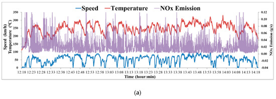 The differences in operating modes for different source types of HDDVs result in the uncertainty of the emissions estimations. For the HDDVs equipped with SCR systems, the NOx emissions are affected by the temperature of the exhaust gas []. Even for the same operating speed or vehicle specific power (VSP), there is a significant variation in NOx emissions caused by the different exhaust gas temperatures. However, current studies about NOx emission estimations do not consider the temperature of the exhaust gas, and the emission rates are directly calculated using the field data, which leads to an inaccuracy of the emissions measurement.