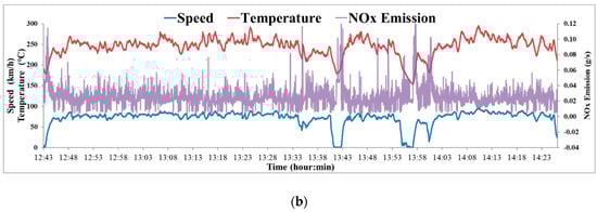 Comparison of speed, temperature, NOx conversion rate and NOx emission of transit buses in different operating modes. (a) Urban transit buses; (b) Suburban transit buses.