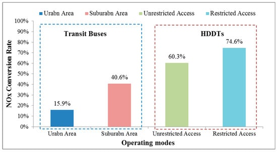 Comparison of the NOx conversion rate between the transit buses and HDDTs under different operating modes.