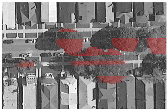 Graphic depicting areas of impervious pavement, sidewalk, and roof surfaces concealed by tree canopy. The areas shaded in red go undocumented by two-dimensional approach. Not to scale, for illustration only. Source: Google Earth, 2019. Illustration: by authors.
